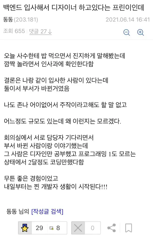 아니 글쓴이가 못참고 먼저 문의한게 웃기네 ㅋㅋㅋ 디자인으로 입사해서 개발팀으로 가면 두달 절대 못버티는데 ㅋㅋㅋ