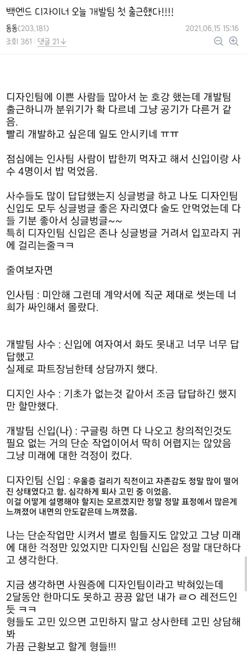 지금 생각하면 사원증에 디자인팀이라고 박혀있는데 2달동안 한마디도 못하고 끙끙 앓던 내가 ㄹㅇ 레전드인 듯 ㅋㅋ 형들도 고민 있으면 고민하지 알고 상사한테 고민 상담해 봐 가끔 근황보고 할게 형들!!