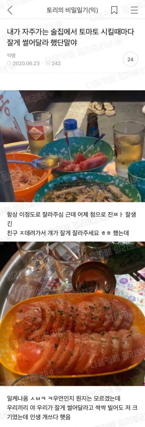 내가 자주가는 술집에서 토마토 시킬때마다 잘게 썰어달라 했단말야