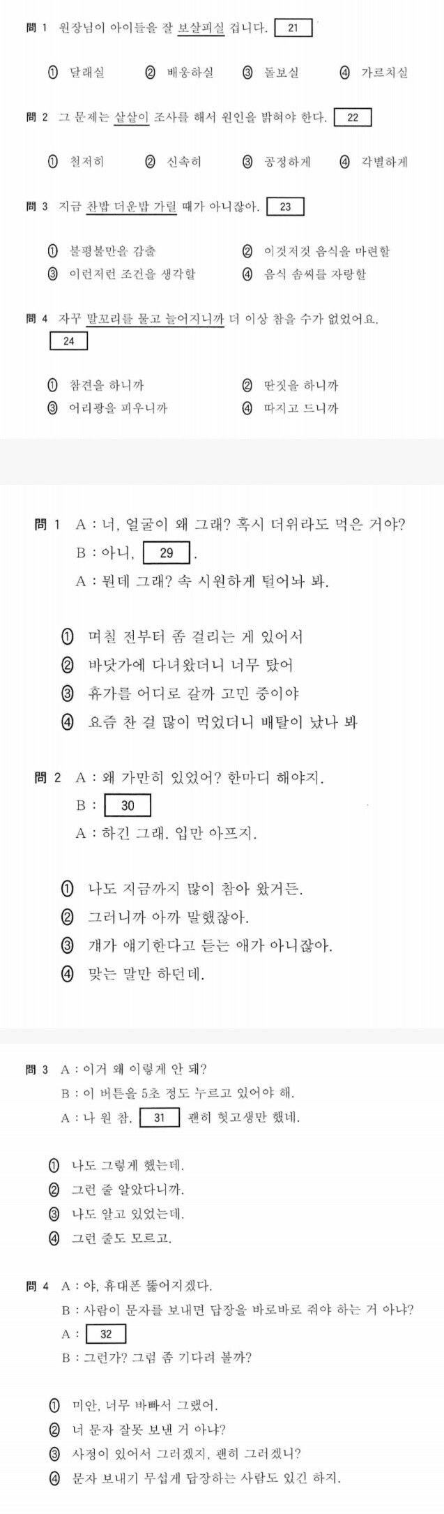 문제 꽤 난이도 있네 거기다 시간 압박도 있으면 외국인한테 꽤 힘들듯; 근데 관용구처럼 쓰는 것들도 있으니깐 외우는 것도 ㅈㄴ 많겠다.