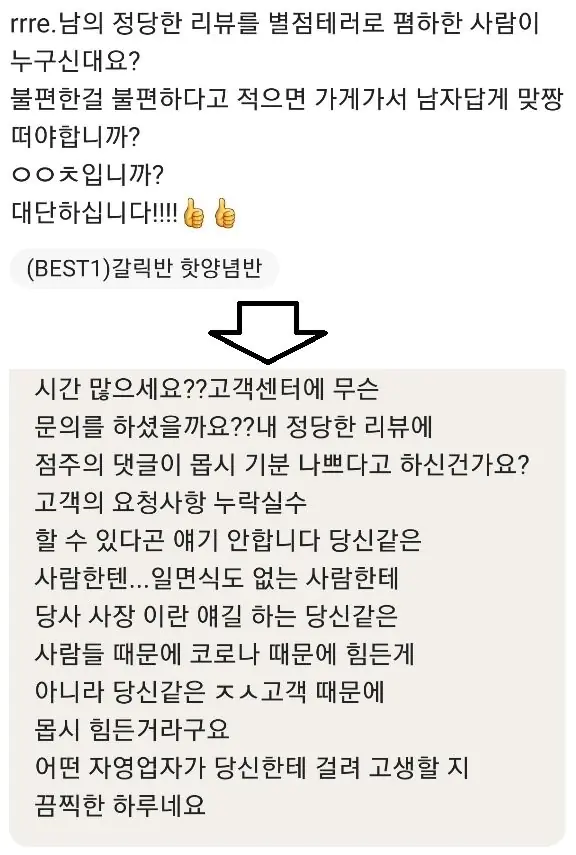 아니 사장은 도대체 어떤 인생을 살았길래 고객의 정당한 비난에 남자답게 가게와서 맞짱뜨던가 ㅇㅈㄹ이냐? 무슨 ㅆㅂ 김성모 유니버스냐?