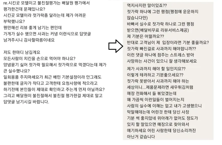 딴건 모르겠고 '내가 트집잡아서 환불을 해달라 했냐, 리뷰거지처럼 굴길 했냐' 이랬는데 대답을 당신?? 환불?? 나무젓가락 안줬다고 환불해달라면 환불해줘야됩니까?? 이러는거 보면 진짜ㅋㅋㅋ 내가 다 스트레스받네