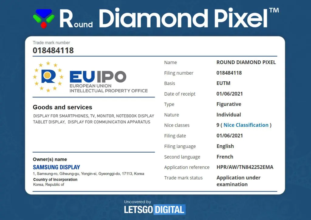 삼성 디스플레이는 2021년 6월 1일 'Round Diamond Pixel'로 상표권을 출원했습니다. 신청서는 유럽연합 지적재산청 (EUIPO), 영국 지적재산청 (UKIPO) 및 한국 지적재산청(KIPO)의 3개 이상의 공식 기관에 제출되었습니다.
