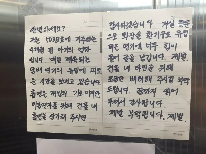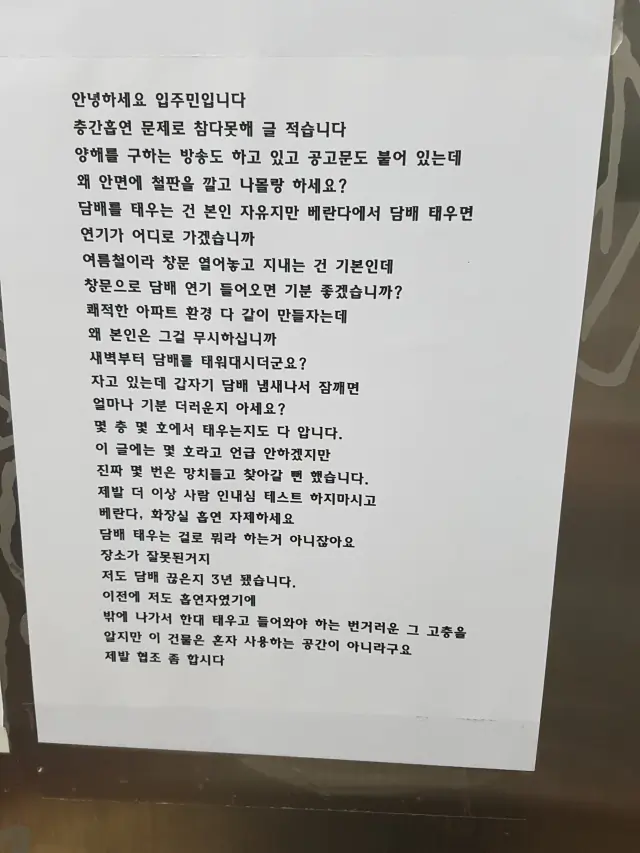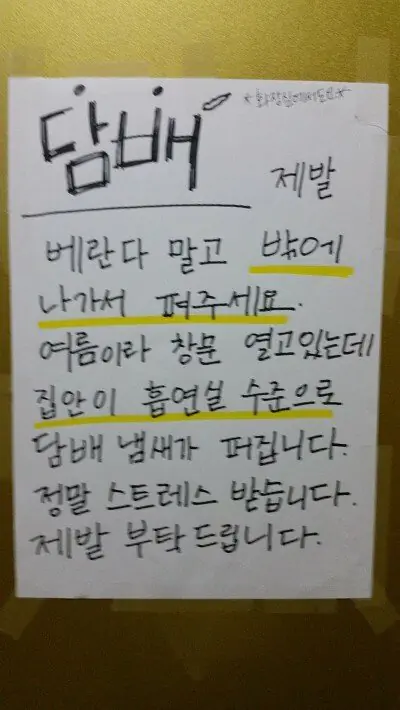 본인 집에서 피는건 뭐라 안하겠는데 창문 열어놓고 펴서 꼭 위로 담배냄새 올라오게 만든다.온 집에 담배냄새 나서 몇번 매너있게 말해도 그때뿐이고 또 핌. ㅋㅋ씨부레 이새끼들은 매번 뭐라고 안하니까 냄새 안나는걸로 생각하는 듯. 양심 출타한 ㅅㄲ들 많음.