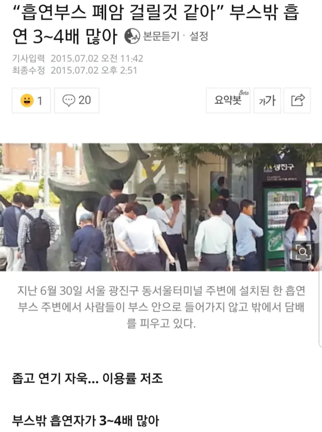 당장 뉴스 기사에서 부스 밖 흡연률이 3~4배 많다는데 뭔 지혼자 밖에서 피는 비율 1~2고 나머지 8~9가 안에서핌??ㅋㅋㅋㅋㅋ 나도 여태 살면서 흡연부스 안에서 피는 사람은 몇명 있지도않고 죄다 밖에서 쳐피는것만 봤는데 뭔ㅋㅋ