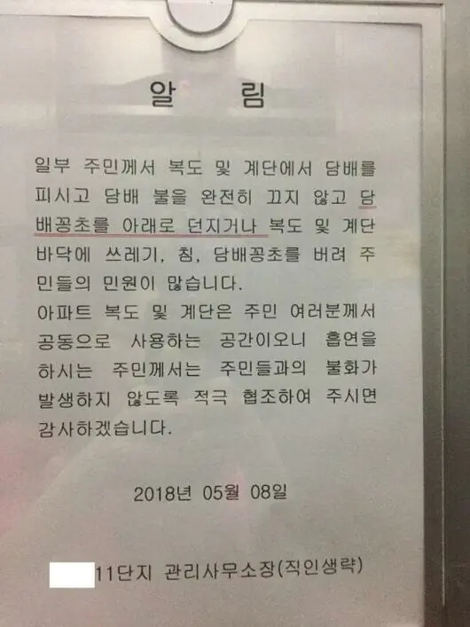 아파트 전체 금연하려다 흡연자들 반발 심해서 단지 외곽쪽에 흡연구역 만들어 줬는데 저지랄임