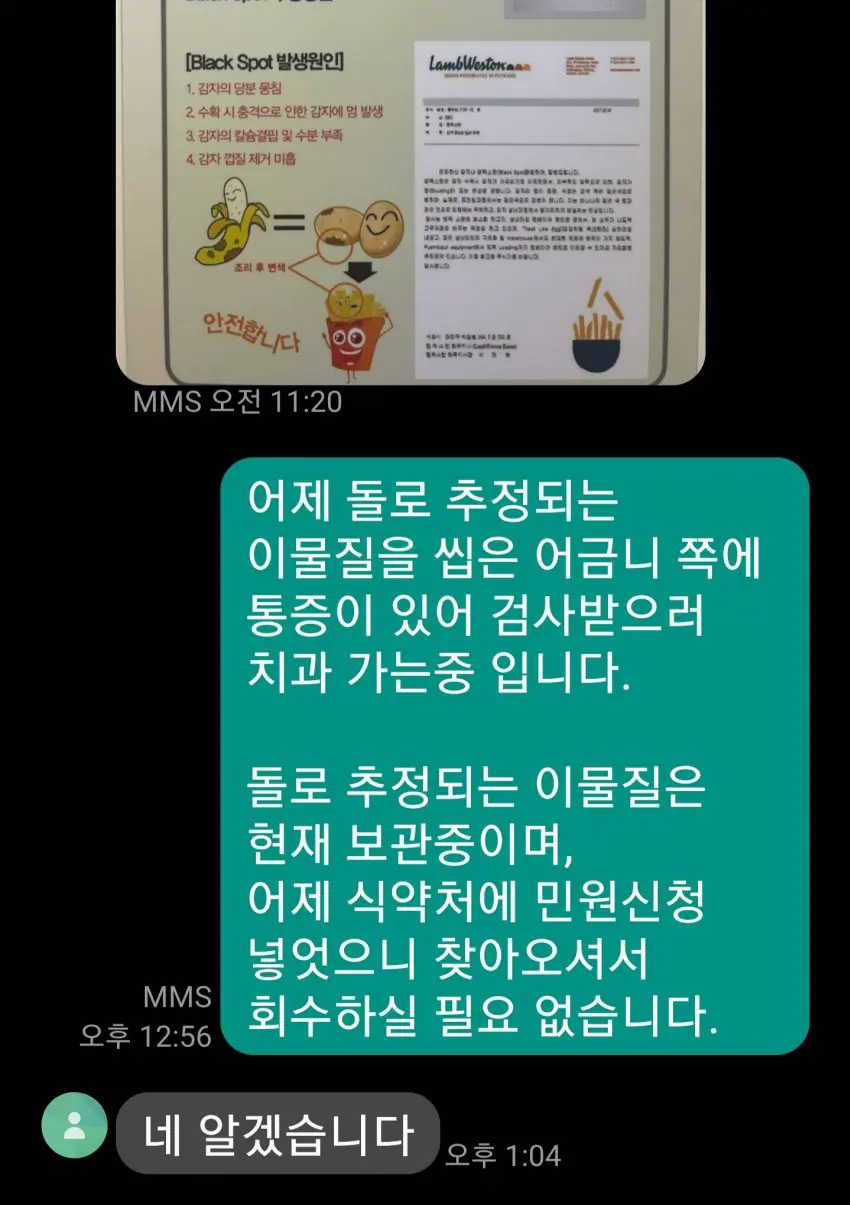 애초에 난 black spot으로 클레임 건것도 아니고 감자튀김에서 돌나왔다고 민원 넣은건데