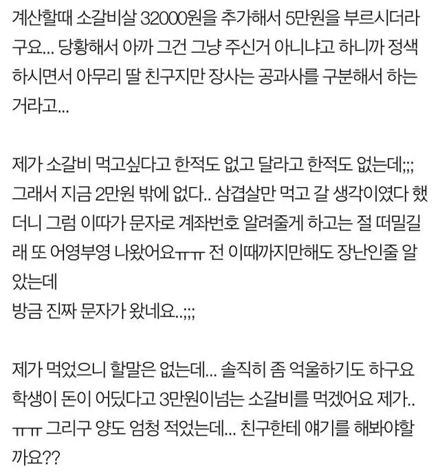 학생이 돈이 어딨다고 3만원이넘는 소갈비를 먹겠어요 제가.. ㅠㅠ 그리구 양도 엄청 적었는데... 친구한테 얘기를 해봐야할까요??