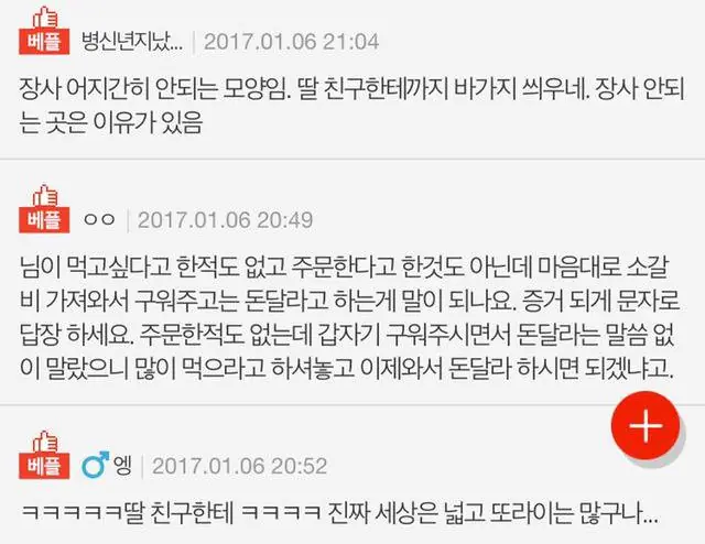 공과 사를 구분할줄 알아야 하는건 본인아니노?? 친구 딸이라 만만해도 그렇지 어디 주문도 안했는데 고기를 들이밀어서 막 굽고 돈을 받냐?