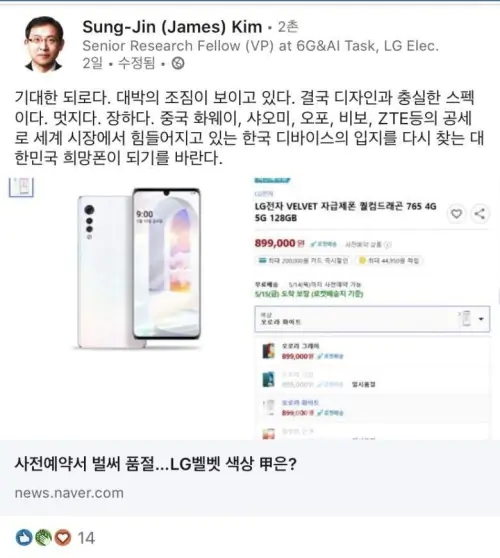 디자인 UI이런건 좀 맘에 드는데.. 이제 LG 명성도 많이 깎이기도 하고 여태까지 이상한 폰만 내놨기 때문에 그냥 저걸 굳이 사고싶어할 사람은 없을꺼 같습니다.. LG에서 작은화면 플레그쉽 내주면 살수도,,? 벨벳SE 나오면 전 살게요 ㅋ