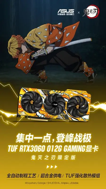 ASUS GeForce RTX 3060 TUF Demon Slayer ASUS ROG China unveils a new product line inspired by the Japanese manga Demon Slayer: Blade of Demon Destruction. The new products are available in three colors, yellow, green, and pink, with each product dedicated t
