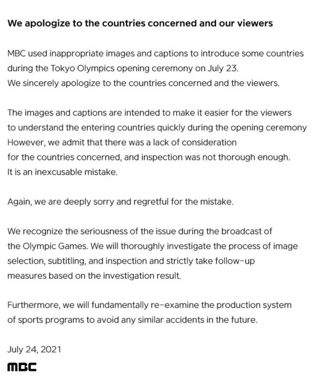 “We apologize to the countries concerned and our viewers. It is an inexcusable mistake. Again, we are deeply sorry and regretful for the mistake. July 24, 2021 MBC”