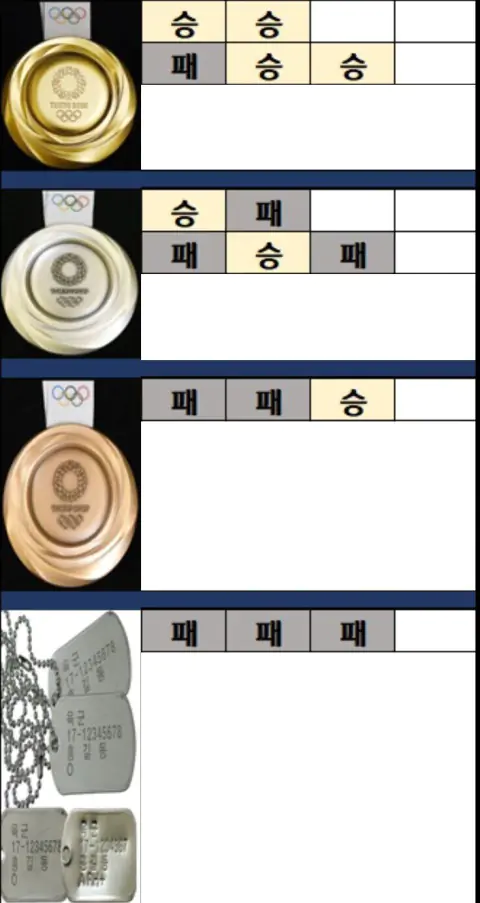 2연승 = 금메달, 1승 = 은메달, 2연패 = 동메달, 3연패 = 군번줄