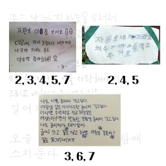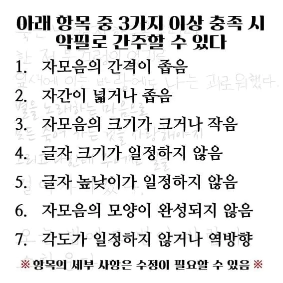 그럼, 먼저 아래 요소들을 보고 내 글씨가 악필에 해당하는지 생각해 보자.