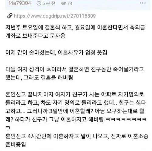 저번 주 토요일에 결혼식 하고, 월요일에 이혼한다면서 축의금 계좌로 보내준다고 문자 옴