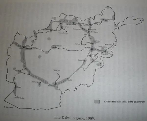 (유사한 사례인 소련-아프가니스탄 전쟁의 결과, 회색이 소련군과 괴뢰정부가 통치하던 지역)