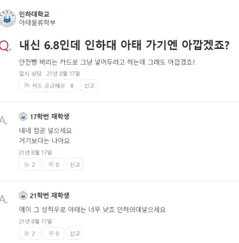 성신여대는 부실대 그러려니 하는데 인하대는 신기하네 ㅋㅋ