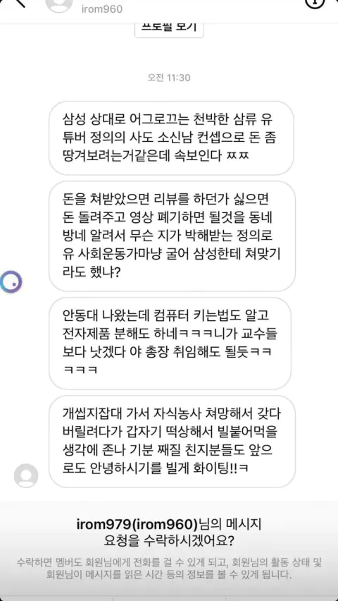 안동대 나오고 지랄이고 저 ㅄ 평생 벌 돈 잇섭은 몇 년이면 뚝딱 벌고 떵떵거리며 사는게 팩트지 ㅋㅋ 디엠으로 일침박는 일침충 검거