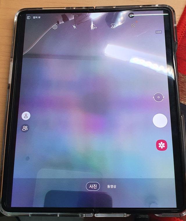 갤럭시 Z 폴드 3 삼성 투 고 서비스로 사용했는데 빈 플라스틱 통을 툭 떨어트렸는데 저렇게 됐다네요.