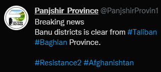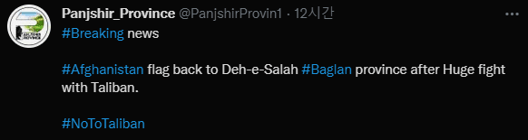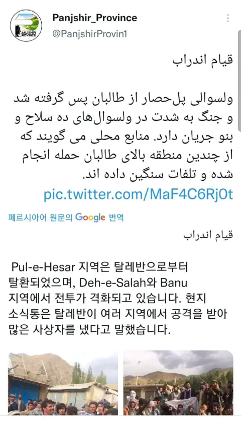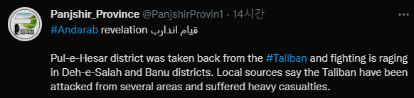 아흐마드 마수드의 판지시르 저항군이 오늘 Pul-e-Hesar 지역을 탈환했다고 함