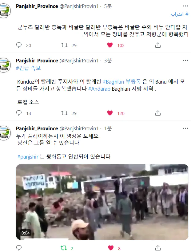 저항군 트위터에 따르면 저항군 민병대는 방어하기 용이한 지역으로 후퇴했었음. 그러자 탈레반이 저항군 잡으려고 여자와 아이들 납치하고 살해하였고 할배들이 봉기함. 그리고 저 동네 할배들이 역전의 용사들임. 젊은 시절 아프간 공산괴뢰군 + 소련군/ 탈레반과 싸웠었음. 그리고 평시에도 부족간에 목초지나 수자원 갈등으로 언제 죽어도 이상하지 않음.
