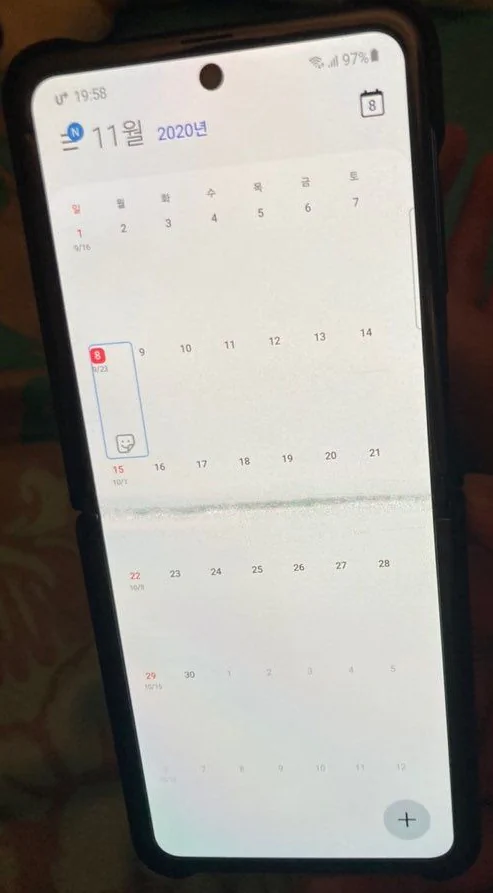 2주일? 무난히 잘 사용했습니다 폴더블 폰의 신세계를 경험 하면서 불편하기도 하고 좋기도 하고 하면서요 그냥저냥 잘사용했습니다 그런데 며칠전 자기 전 휴대폰 충전 후 일어나 휴대폰을 열어보니 가운데 줄이 선명하게 생겨 있더라구요? 잘못본줄 알았습니다 그런데 자세히 보니 가운데 줄이 너무 선명했습니다