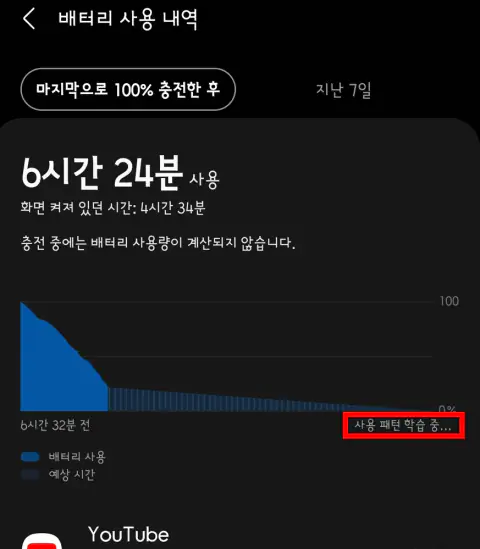 배터리 학습 중에 사용자가 휴대폰을 많이 쓰기 때문에 배터리가 빨리 닳는 것이죠.