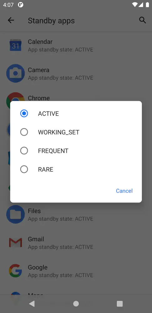 App Standby(앱 대기) 기능도 안드로이드 6.0부터 도입되었습니다. 그러다가 안드로이드 9에서 더 발전된 형태인 App Standby Buckets이 등장했습니다.