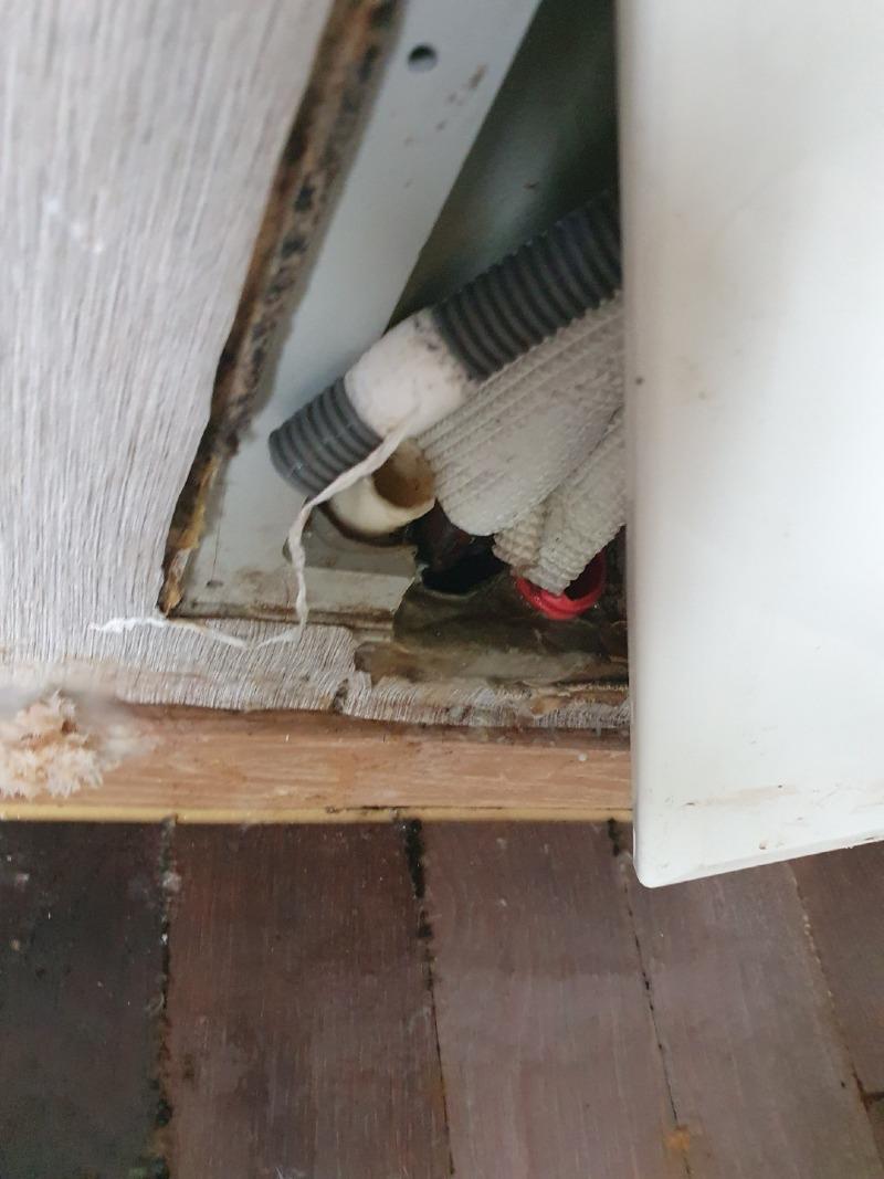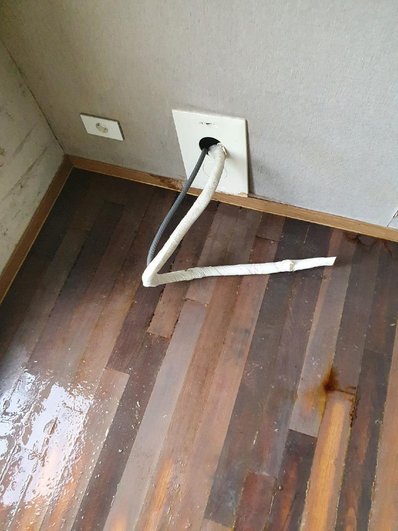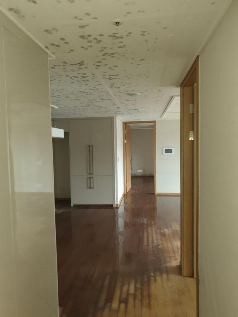 3년 조금지난 아파트이며 입주시 부터 있던하자입니다. 층수는 2층 필로티이며 에어컨공용배관에서 역류하여 생긴 하자입니다 모든방과 거실 드레스룸까지 영향을 끼치고있습니다