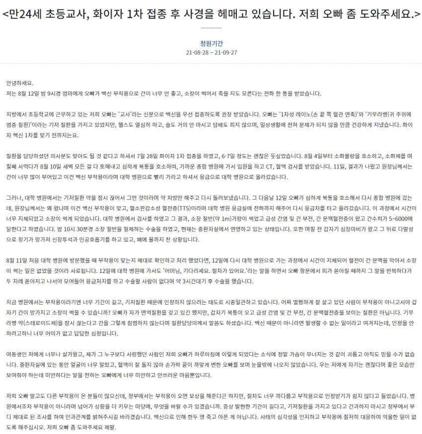 제발, 기저질환이 있다고해서, 주사 맞고 기간이 길다고 해서 간과 하지마시고 제대로 된 조사를 해 주셔서 인과관계를 밝혀 주세요