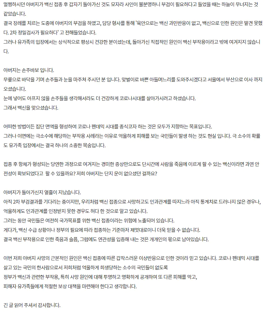 이번 저희 아버지 사망의 근본적인 원인은 백신 접종에 따른 갑작스러운 이상반응으로 인한 것이라 믿고 있습니다. 코로나 펜데믹 시대를 살고 있는 국민의 한사람으로서 저희처럼 억울하게 희생당하는 소수의 국민들이 없도록 정부가 백신과 관련한 부작용, 특히 사망 원인에 대해 투명하고 명확하게 공개하여 또 다른 피해를 막고, 피해자 유가족들에게 적절한 보상 대책을 마련해야 한다고 생각합니다.