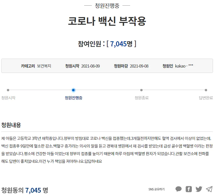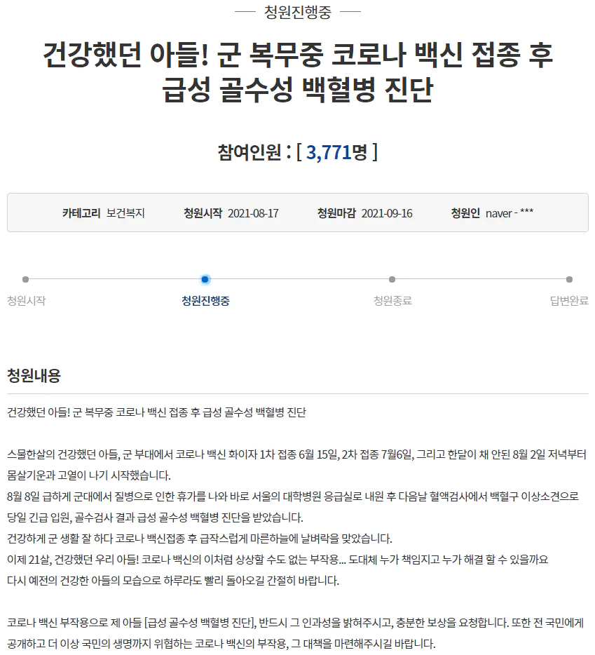 고교생 아들이 코로나 바이러스 감염증(코로나) 백신 접종 9일 만에 백혈병 판정을 받았다는 아버지의 청원이 등장했다. 고등학교 3학년생 아들을 둔 A씨의 글은 지난 9일 청와대 국민청원 게시