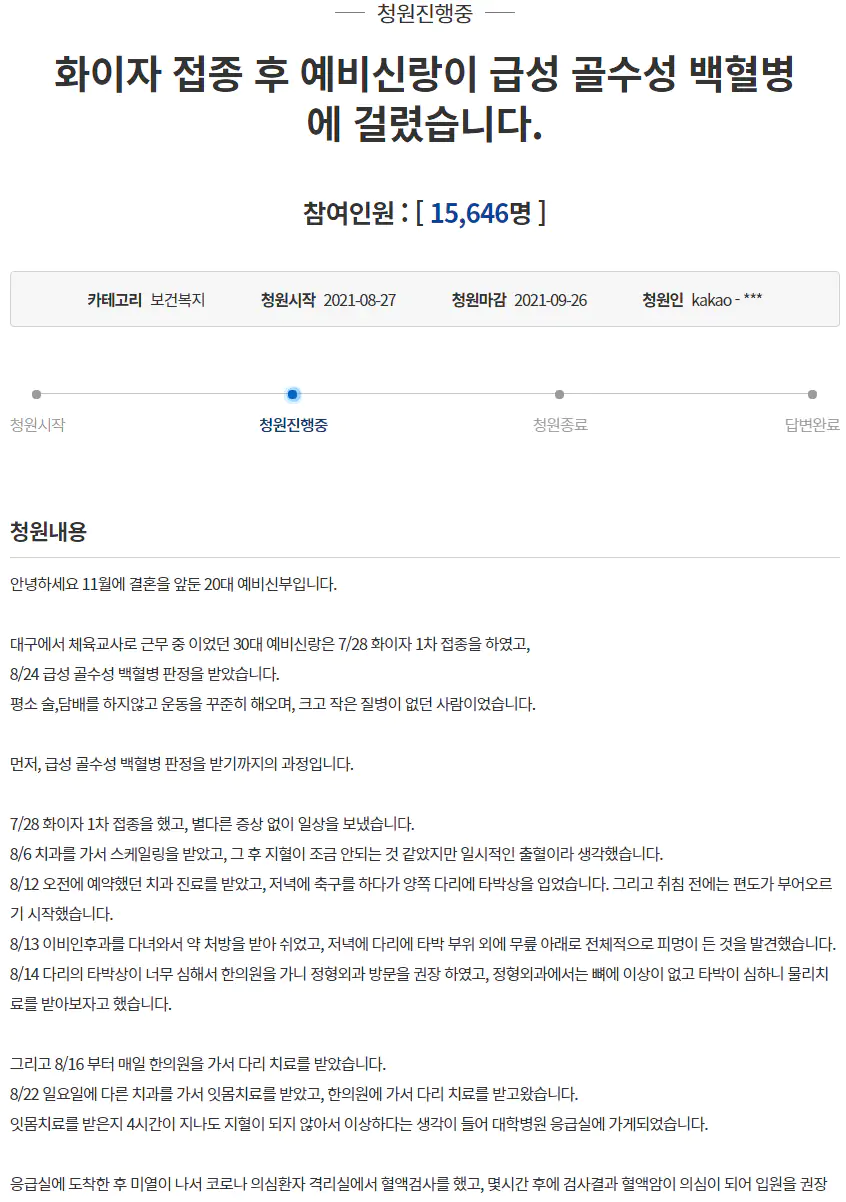 결혼을 앞두고 있던 체육교사 예비 신랑이 신종 코로나바이러스 감염증(코로나19) 화이자 백신을 맞고 백혈병에 걸렸다는 내용의 국민 청원이 올라왔다. 오는 11월 결혼을 앞둔 예비 신부라고 자