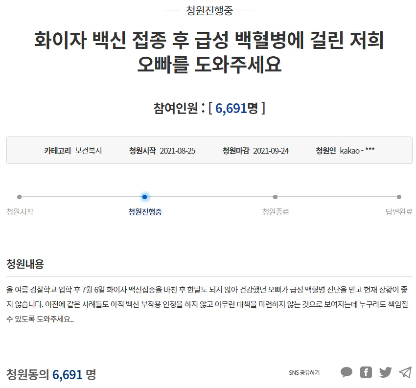 올 여름 경찰학교 입학 후 7월 6일 화이자 백신접종을 마친 후 한달도 되지 않아 건강했던 오빠가 급성 백혈병 진단을 받고 현재 상황이 좋지 않습니다. 이전에 같은 사례들도 아직 백신 부작용 인정을 하지 않고 아무런 대책을 마련하지 않는 것으로 보여지는데 누구라도 책임질 수 있도록 도와주세요..
