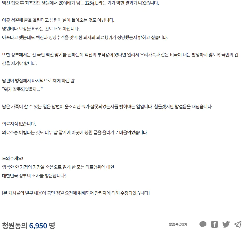 또한 정부에서는 전 국민 백신 맞기를 권하는데 백신의 부작용이 있다면 알려서 우리가족과 같은 비극이 더는 발생하지 않도록 국민의 건강을 지켜야 합니다.