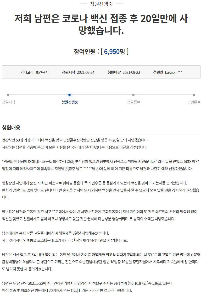 남편은 백신 접종 후 3일 내내 열이 있는 동안 병원에서 지어준 해열제를 먹고 버티다가 3일째 되는 날 39.4도의 고열로 인근 병원에 방문해 급성백혈병이 의심되니 큰 병원으로 가라는 진단으로 화순전남대병원 입원 18일중 16일을 중환자실에서 사투하다 가족들에게 말 한마디도 남기지 못한 채 돌아가셨습니다.