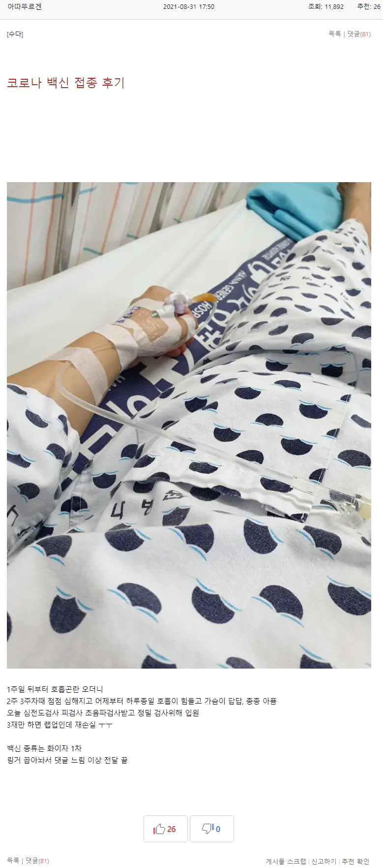 극악의 확률이기엔 주변에 저런사람이 많은데? 당장 우리엄마도 화이자 1차맞고 갑자기 아파서 응급실 갔다왔었음. 죽는거는 확률이어도 저정도 아픈거는 흔한데?