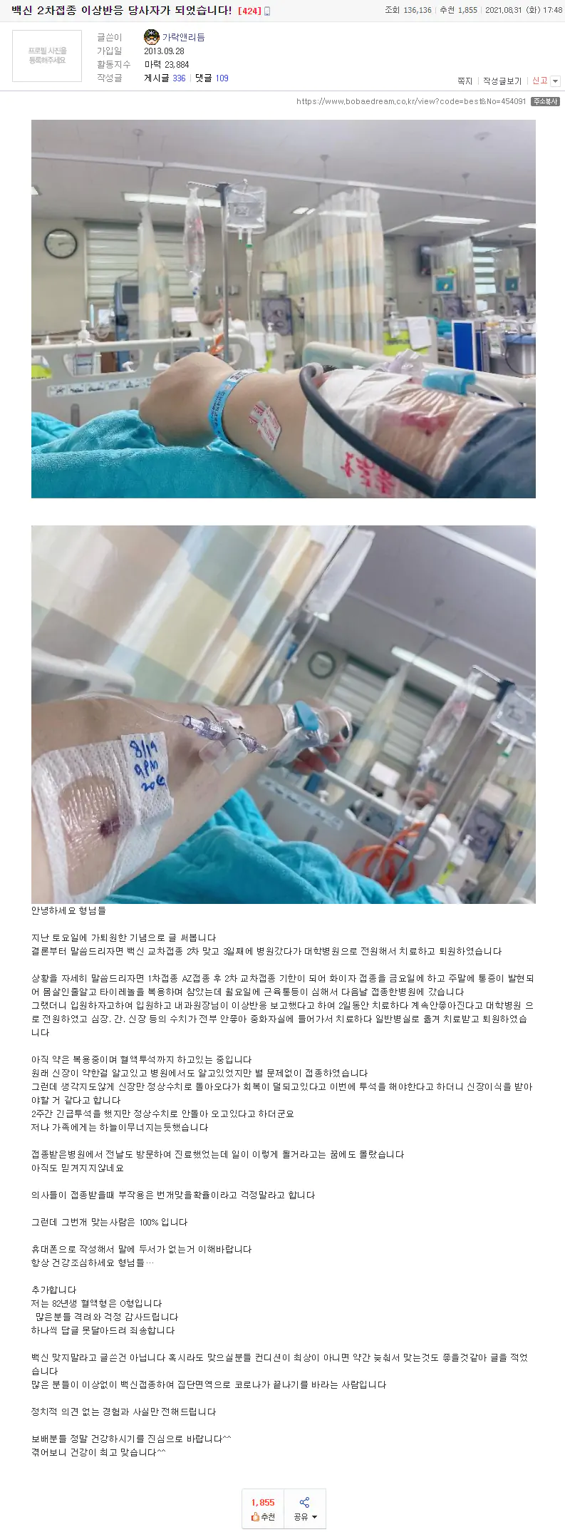 백신 2차접종 이상반응 당사자가 되었습니다! | 보배드림 베스트글