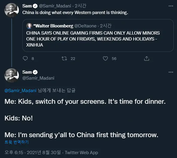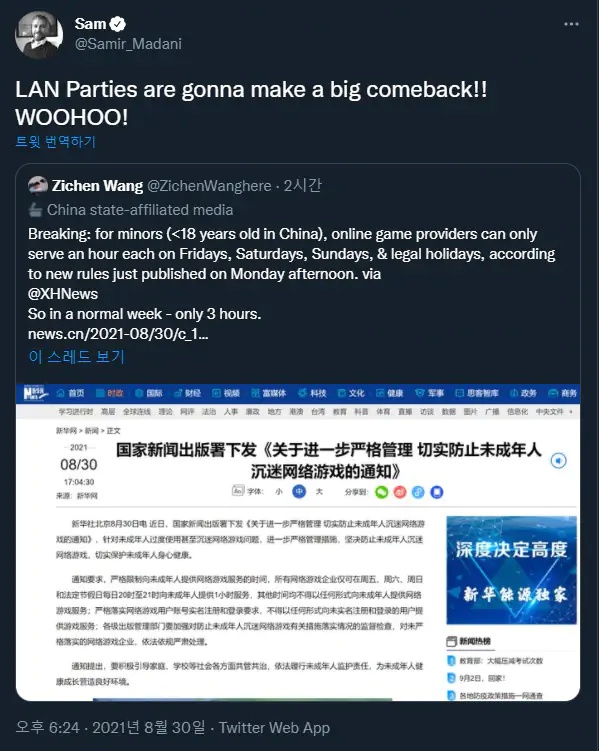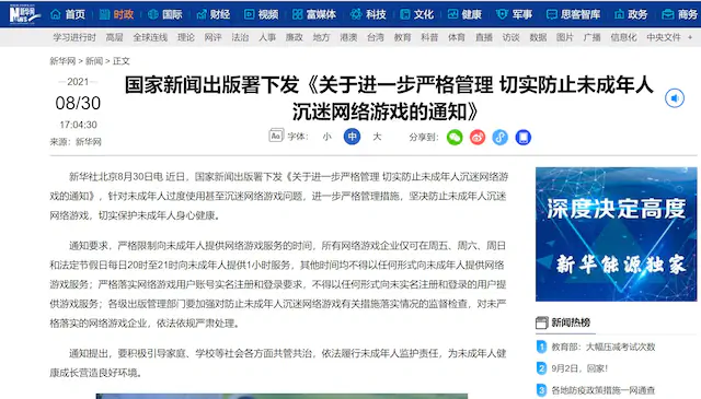 공산당과 텐센트-넷이즈 같은 중국 거대 기업들의 주가 조작 쇼니 뭐니 말 많았는데 최종적으로 강화된 미성년자 셧다운제 개정해서 통과됨.