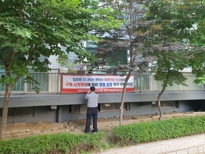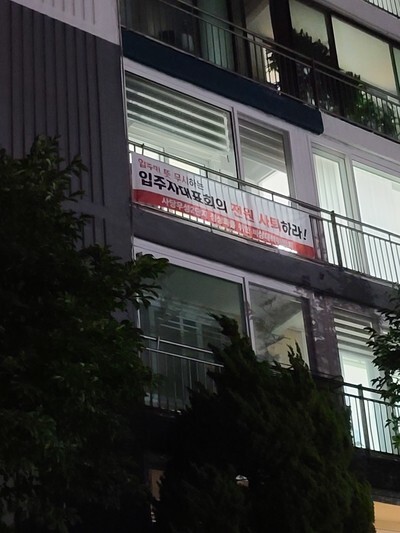 이날 원래 비대위 집회는 오후4시30분부터였다. 하지만 오후 3시50분경 한창 집에서 집회준비를 하는 도중 입주민 분으로부터 제보 문자를 받았다. 우리가 6월18일(금) 입대의회의 때 입주민의 협조로 처음 붙인 베란다 플랜카드를 경비원이 강제로 제거하다가 입주민들에게 발각되어 반쯤 떼다가 저지를 당하고 돌아갔다는 것이었다.