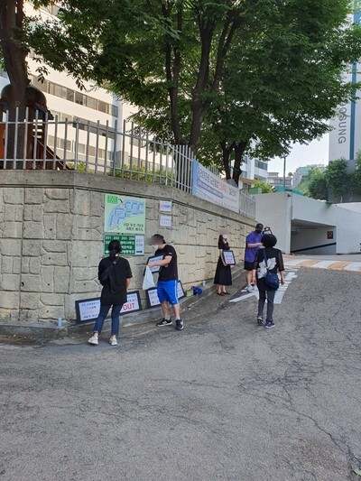 어느덧 집회 시간인 오후 4시30분이 됐고 관리소 앞으로 스무명 가까운 입주민들이 모였다. 한 어르신은 가족들과 잠시 오셨다가 오늘은 부득이하게 참석을 못하니 다음번엔 꼭 참석하겠다며 응원을 해주시기도 했다. 우리는 두 그룹으로 나눠 한 그룹은 208동 후문을 맡고 또 다른 그룹은 테니스장 방면 후문을 각각 맡아 피켓시위를 시작했고 미리 준비해 둔 유인물들을 입주민들에게 나눠드리기 시작했다.
