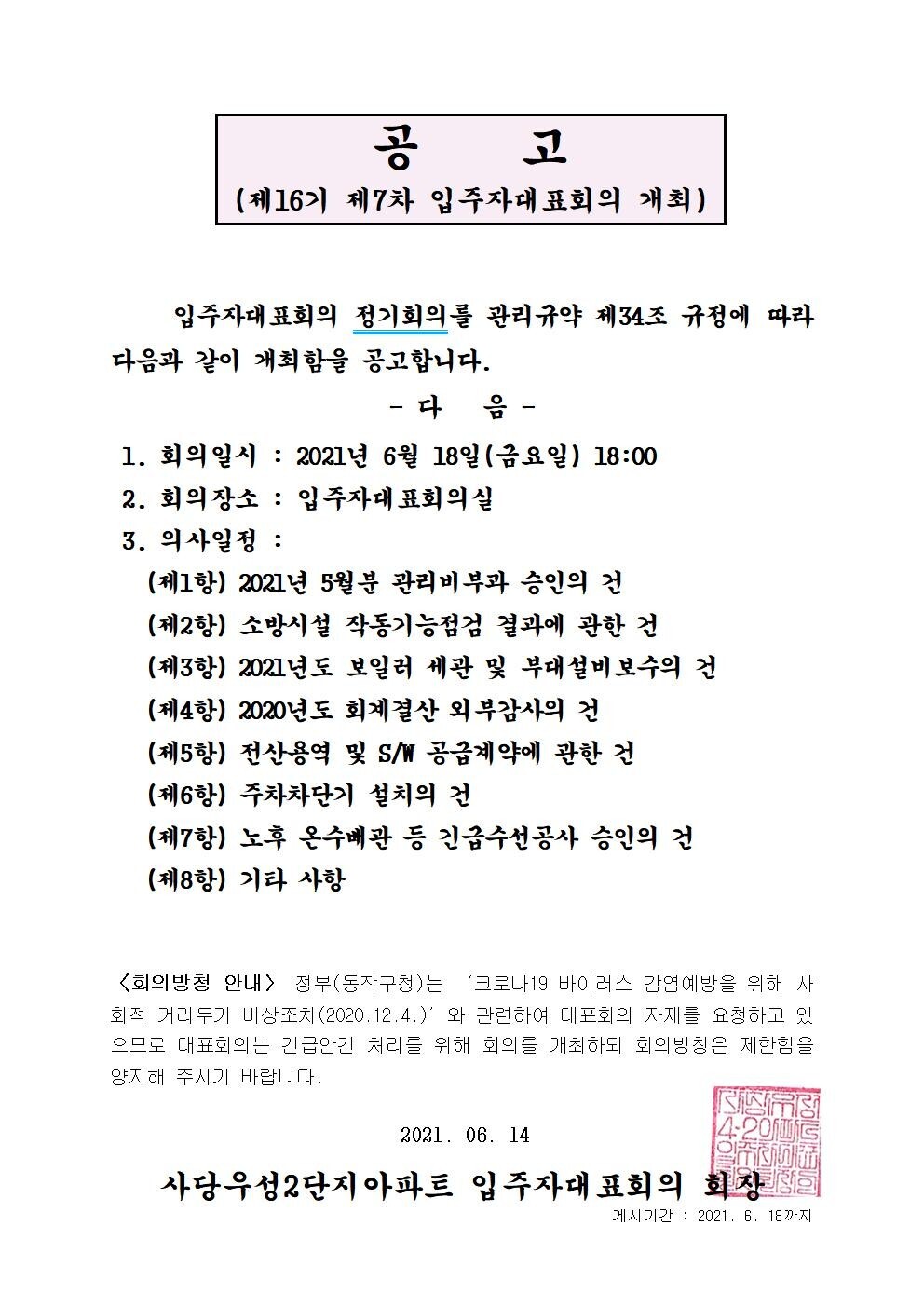 하지만 6월18일(금) 제7차 입주자대표회의 공고에서는 아무리 찾아봐도 관리위탁 재계약에 대한 어떠한 안건도 찾아볼 수 없었다. 당장 6월30일이 관리소 계약 만료이면서 동시에 동작구청 최종 시정명령 이행 마감일임에도 불구하고 지난 입주자대표회의 때 '사법부의 판단을 받아본 후 재심의하기로 의결'해 놓고 그간 어떠한 고민도 없었던 것이다. 왜냐하면 아무 고민없이 그냥 버티기만해도 기존 관리소와 일할로 계산되는 연장계약을 자연스럽게 할 수 있기 때문이다.(이건 위법한 부분은 아니다. 다만 재계약도 못하고 그렇다고 경쟁입찰도 안하고 있는 입대의의 더러운 꼼수가 못마땅할 뿐)
