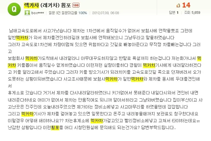 사고 후 보험사 접수하고 있는데~ 검은 매연 내뿜으며 누가봐도 양카스퇄의 렉카가 내 차에 똥꼬를 들이댐... 보험차 불렀으니... 차 빼라고 함~ 지가 보험사에서 보낸 차라 함... ㅎ 그 찬라 보험사 렉카 기사한테 전화 옴... 이제 출발한다고 정확한 위치가 어디냐고~ ㅜㅜ 사설 렉카기사한테 개소리하지 말고~ 차 빼라함... 슬슬 비꼬듯 처 웃으면서 차를 안 뺌... 잠시 후 보험사 렉카 옴 차 빼라고 하자~ 눈까리만 치켜 뜸... 결국, 한 10여분 쯤 지나서 경찰차 오고~ 저 양아치 렉카가 안비켜줘서 보험사 렉카가 차를 못 걸고 있다고 고자질 함 ㅋ 경찰관 눈치를 보니 서로 아는 사이인듯... 그러나 저라나 어쩌겠음? 슬슬 눈치보면서 차 뺌... 개객기들...