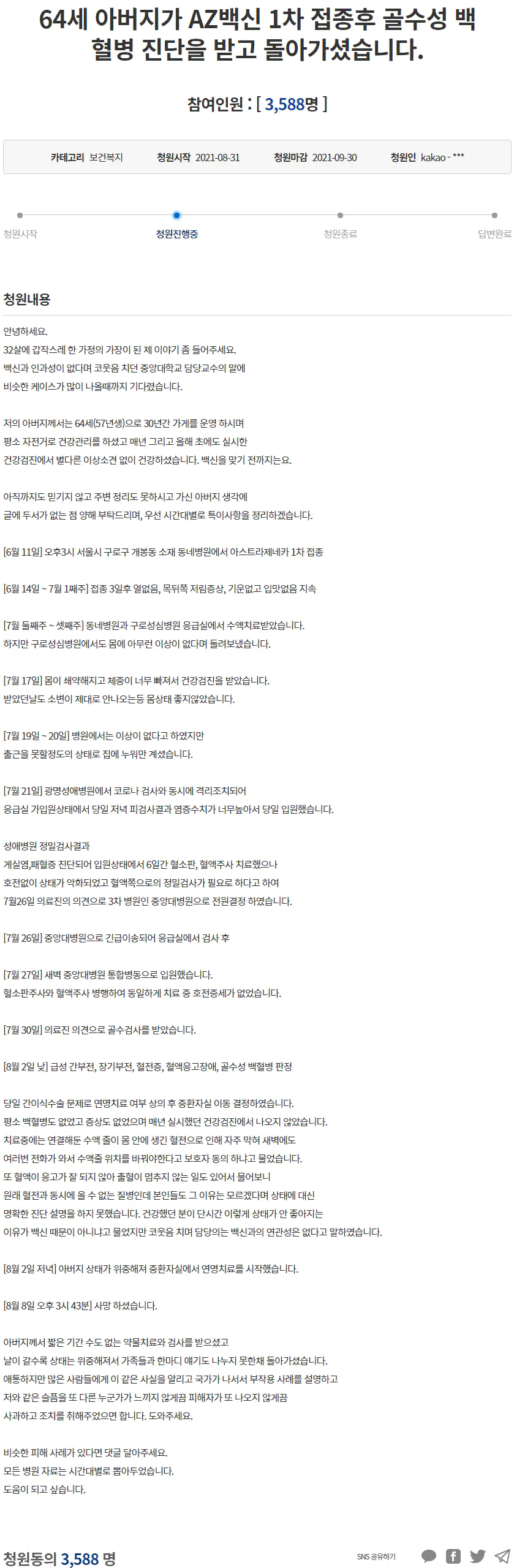 64세 아버지가 AZ백신 1차 접종후 골수성 백혈병 진단을 받고 돌아가셨습니다.