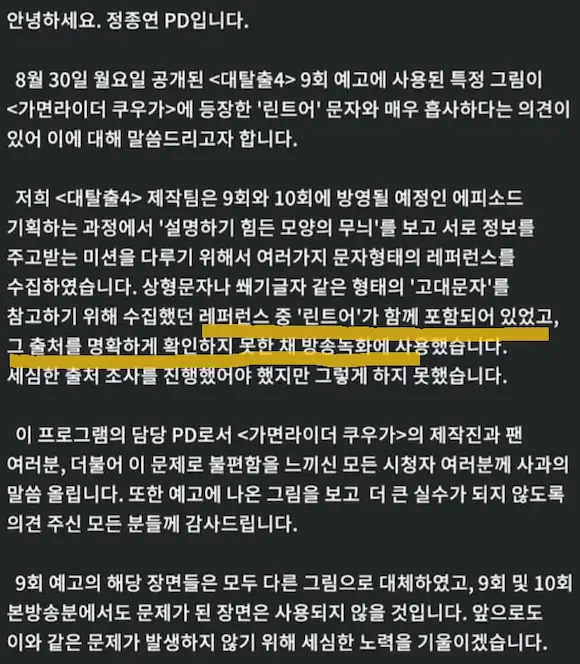 이게 사과문인데 수 많은 레퍼런스 중 우연히 끼어 있어서 별 생각 없이 수정해서 사용 했고 그게 가면라이더인지, 쿠우가인지 린트 문자인지는 지들은 몰랐다 하는데