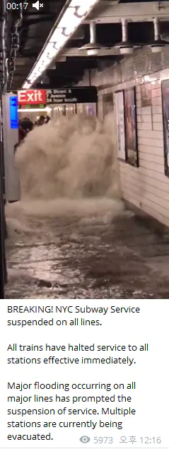 뉴욕 허리케인 아이다 강타해 물난리 물폭탄 대홍수 일어남