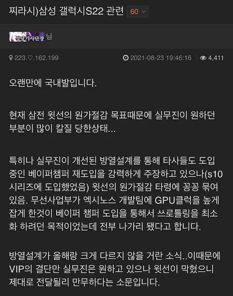 특히나 실무진이 개선된 방열설계를 통해 타사들도 도입 중인 베이퍼챔버 재도입을 강력하게 주장하고 있으나(S10 시리즈에 도입했었음) 윗선의 원가절감 타령에 꽁꽁 묶여있음. 무선사업부가 엑시노스 개발팀에 GPU클럭을 높게 잡게 한것이 베이퍼 챔퍼 도입을 통해서 쓰로틀링을 최소화 하려던 목적이었는데 전부 나가리 됐다고 합니다.