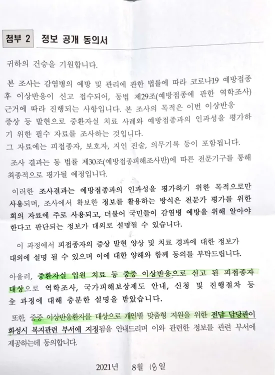 '중증 이상반응환자를 대상으로 개인형맞춤형 지원'을 위한 전담 담당관을 매칭해주기 위해 정보공개동의서에 사인을 하여 보내주면