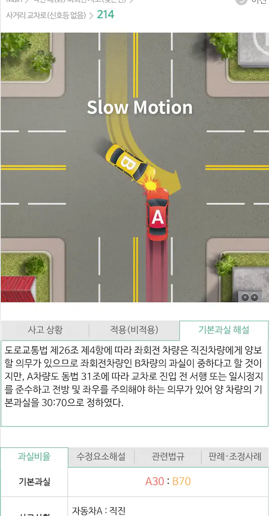 7:3인데 이건 기본과실이고 b의 현저한 과실이랑, b 급 좌회전, b 서행 불이행까지해서 100짜리 사고임 ㅎㅎ
