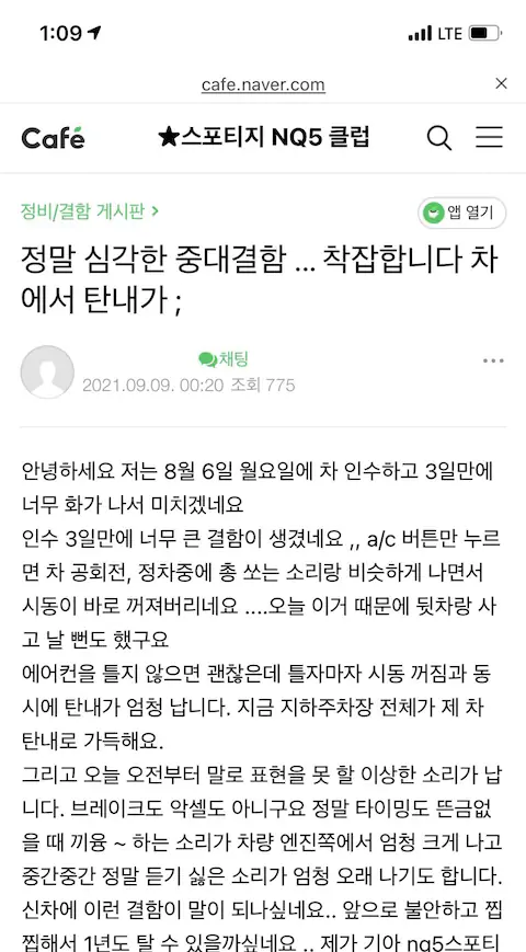 에어컨을 틀지 않으면 괜찮은데 틀자마자 시동 꺼짐과 동시에 탄내가 엄청 납니다. 지금 지하주차장 전체가 제 차 탄내로 가득해요.